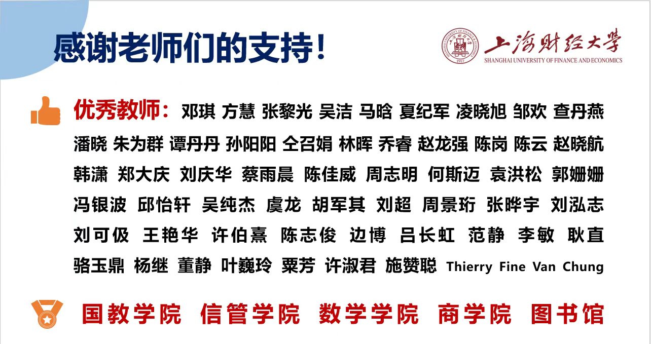本期活动邀请了四位老师做分享,他们分别是信息管理与工程学院方慧老师、国际教育学院张黎光老师、统计与管理学院吴洁老师和金融学院马晗老师。